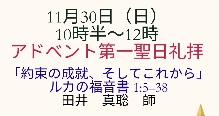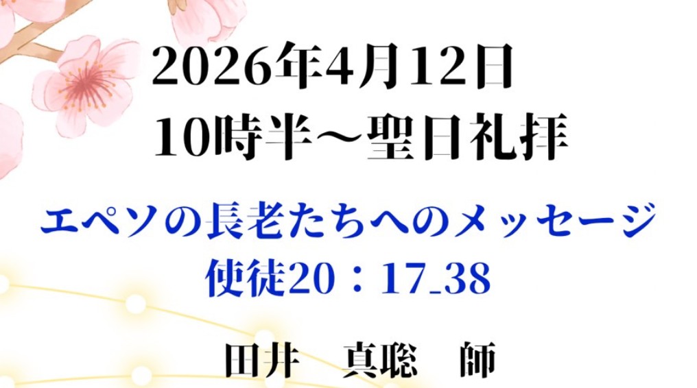 | 祈祷会 | 水曜 19:00~20:45 木曜 10:30~12:30 | シリーズで聖書を学び、祈祷課題に沿って皆さんで祈り合います。 |