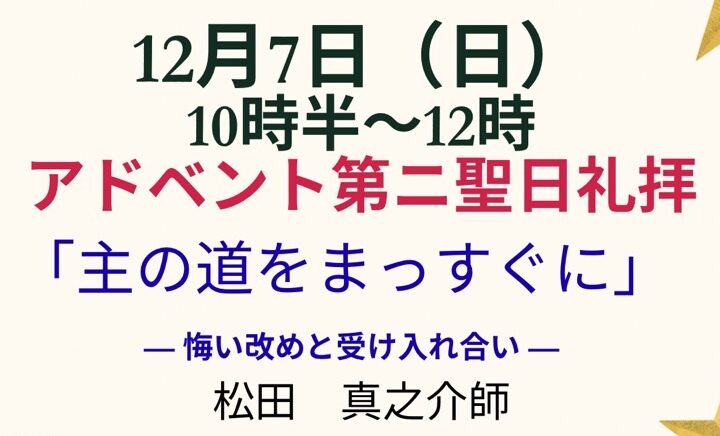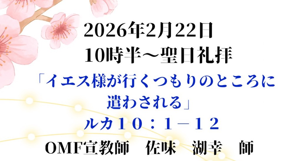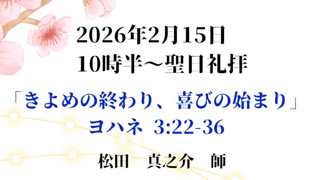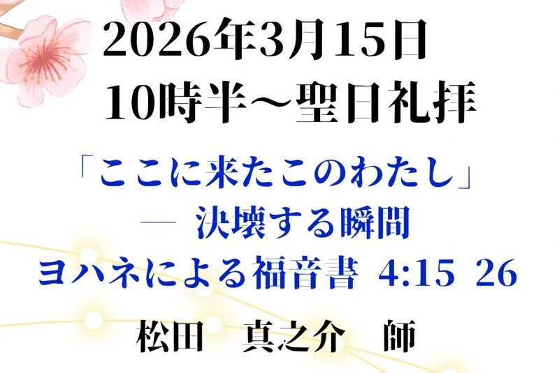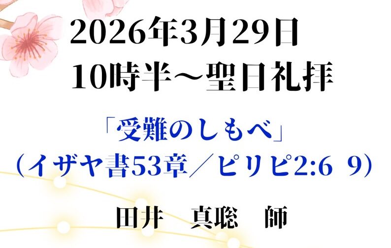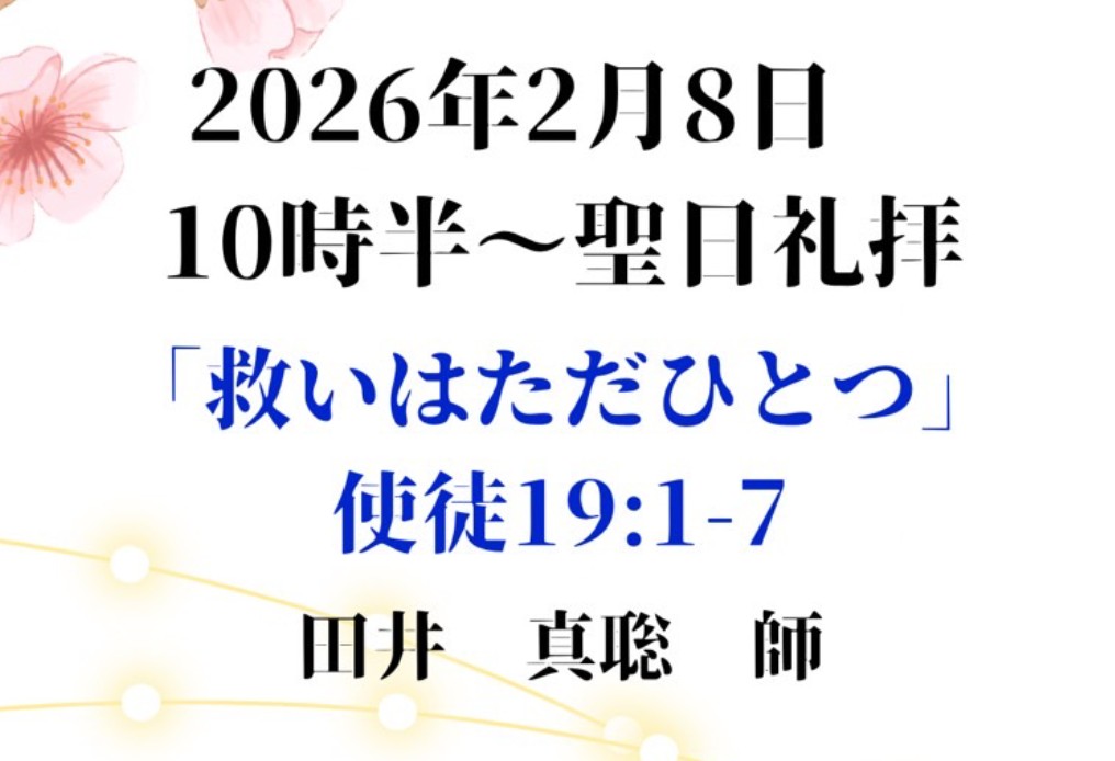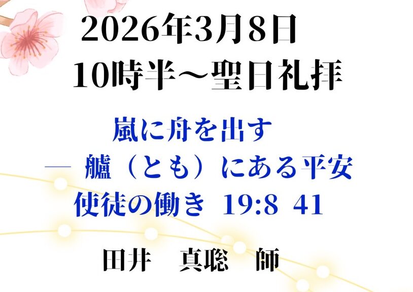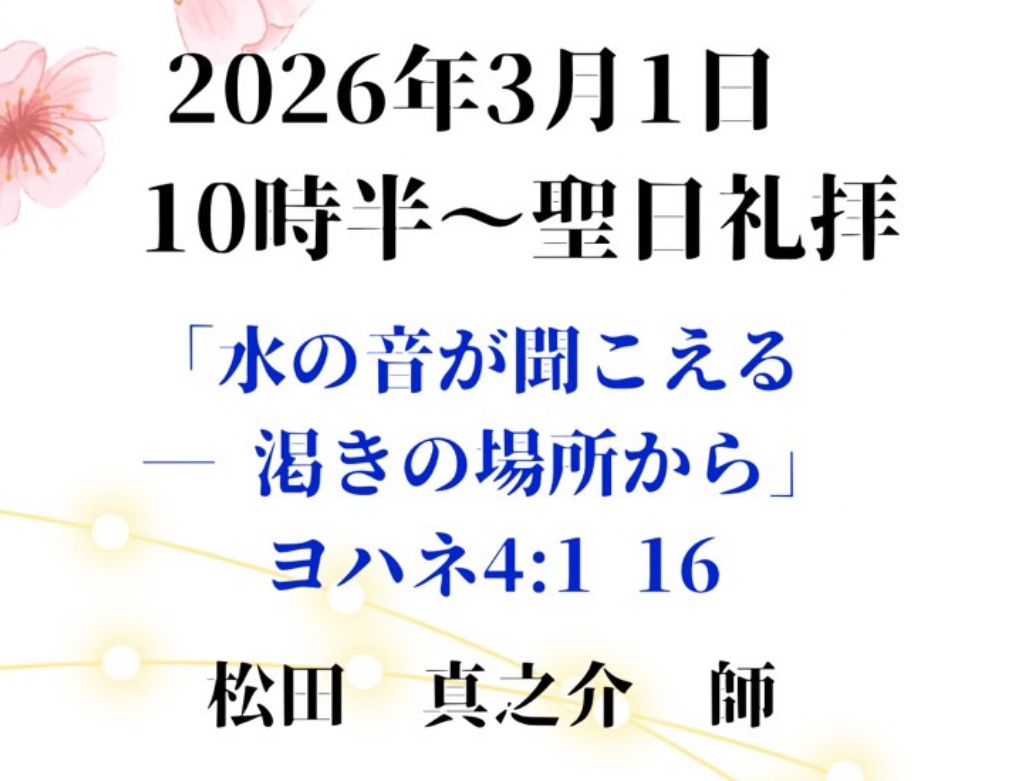 | 祈祷会 ぶどうの木の会 | 水曜 10:30~12:30 | 次の日曜の聖書箇所を学び、祈祷課題に沿って皆さんで祈り合います。 |