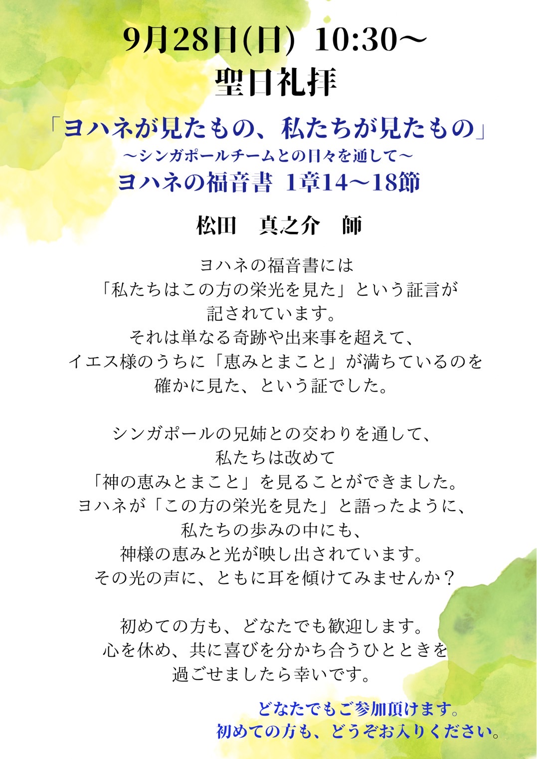 メッセージ  「ヨハネが見たもの、私たちが見たもの」~シンガポールチームとの日々を通して~  松田 真之介 師