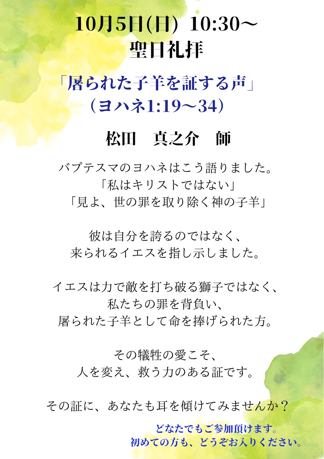 メッセージ 「屠られた子羊を証する声」 松田 真之介 師