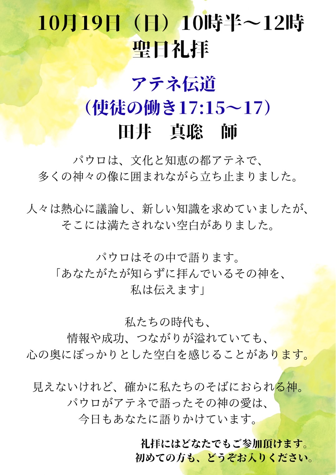 メッセージ 「アテネ伝道」 田井 真聡 師
