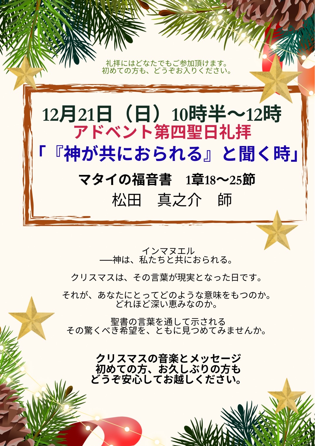 来週の聖日礼拝(アドベント第四聖日礼拝)のお知らせ